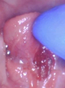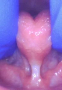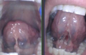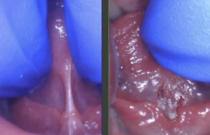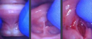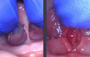 This baby was clipped at the hospital by the pediatrician and her salivary gland openings were turned into a cluster of grape-like openings because the provider clipped right through them and missed the string. Here’s the proper release on that same patient after we used the CO2 laser. Notice the better elevation of the tongue.