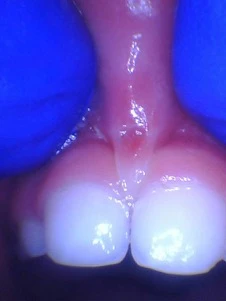For a preschooler, it also is not a treatment strategy. Almost always when the child falls and rips the lip-tie, it only puts a small nick in the tissue (see below) and does not remove the tissue between the teeth. When we do it properly with the laser, all the tight tissue disappears, and then the teeth can properly close. There is now nothing to prevent the migration of the teeth toward the midline (mesial drift). Gap closure works best if done before 18mo old or when the permanent teeth are erupting.